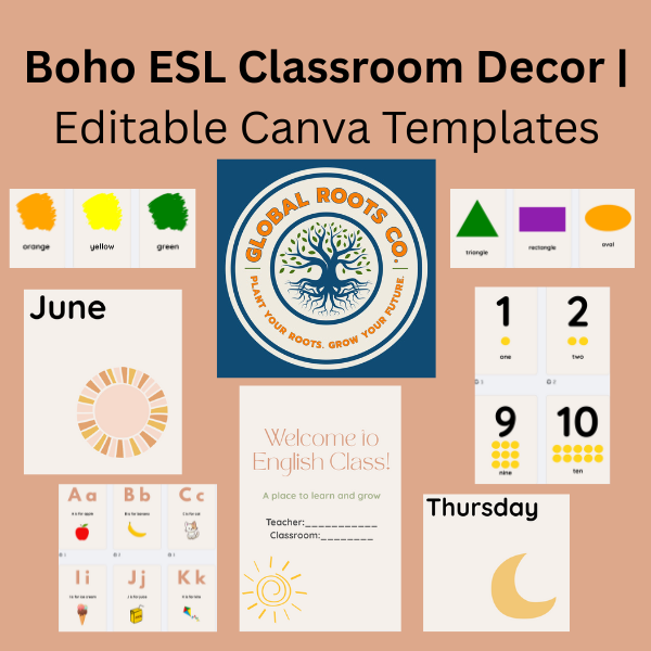 Boho ESL Classroom Decor Bundle | Editable Canva Templates | Alphabet, Colors, Days, Name Tags & More